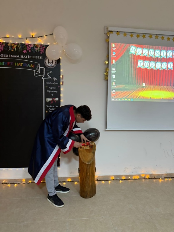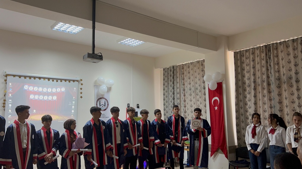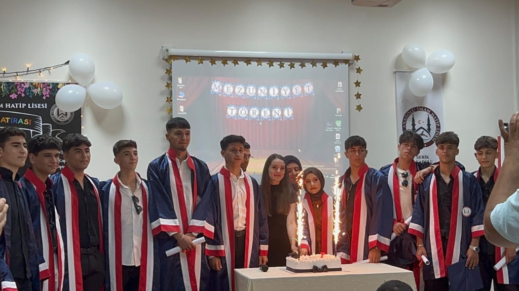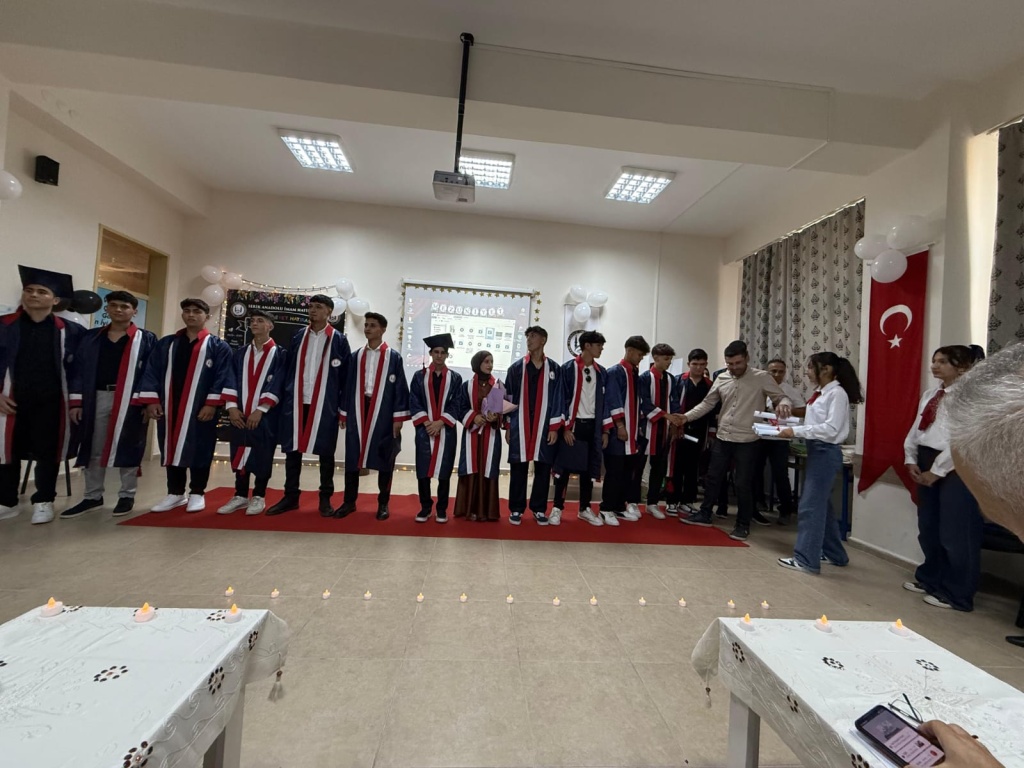 Saygı duruşu ve istiklal marşının okunmasıyla başlayan törende, Kur’anı Kerim tilaveti, Okul Müdürümüzün konuşması, dönem birincisi öğrencimizin yaş kütüğüne isim çakması, temsili diploma verilmesinin ardından, kep atma ve pasta kesme etkinlikleri yapıldı.